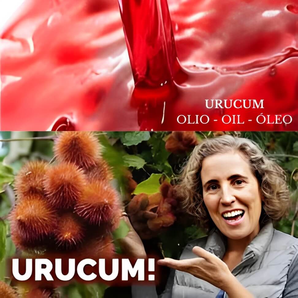 L’URUCUM fa parte della tradizione indigena nella pittura corporale (Semi di Urucum macinati e idratati che formano una crema pastosa), nella lingua degli “indiani TUPIS” significa “rosso”, è un frutto che cresce sull’albero appartenente alla specie Bixa orellana, originaria dell’America tropicale con frutti di cui i semi sono di un rosso molto brillante. L’URUCUM è ricco di carotenoidi, tocoferoli, flavonoidi, vitamina A, fosforo, magnesio, calcio e potassio, dalle proprietà antiossidanti, antimicrobiche e antinfiammatorie e apporta quindi numerosi benefici alla salute.